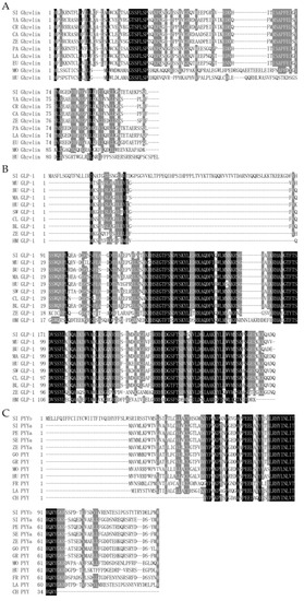 Multiple amino acid sequence alignment of (A) ghrelin, (B) GLP-1, (C) PYYa and PYYb. Amino acids that are blacked indicate that amino acids in that column are identical across all species. Residues that are conserved in more than half of the listed peptides are shadowed. GenBank accession numbers: (A) SI (Silver pomfret) ghrelin; YA (Ya-fish) ghrelin (AEZ36050.1); CR (Crucian carp) ghrelin (ADP55075.1); CA (Grass carp) ghrelin (AFI98391.1); ZE (Zebrafish) ghrelin (ACJ76435.1); PA (Pacific bluefin tuna) ghrelin (BAM34457); LA (Largemouth bass) ghrelin (ACJ13547); EU (European seabass) ghrelin (ABG49130); MO (Mouse) ghrelin (AAI32231.1); HU (Human) ghrelin (ADM33790.1); (B) SI (Silver pomfret) GLP-1; MU (Mullet) GLP-1 (XP_047432601.1); BU (Blue tilapia) GLP-1 (XP_031584898.2); MA (Mandarin fish) GLP-1 (XP_044044264.1); HU (Humphead wrasse) GLP-1 (XP_041638161.1); SW (Swordfish) GLP-1 (XP_039997917.1); CL (Clownfish) GLP-1 (XP_023121936.1); BL (Bluefin tuna) GLP-1 (XP_042261152.1); ZE (Zebrafish) GLP-1 (NP_001258699.1); HM (Human) GLP-1 (NP_002045); (C) SI (Silver pomfret) PYYa; SI (Silver pomfret) PYYb; PE (European Perch) PYYa (XP_039682240.1); ZE (Zebrafish) PYYa (Q9I8P2.1); GO (Goldfish) PYY (ACJ03593.1); GR (Grass carp) PYY (AFE89419.1); MO (Mouse) PYY (AAH10821.1); HU (Human) PYY (P10082.3); FR (African clawed frog) PYY (XP_018092481.2); LA (Large yellow croaker) PYY (XP_019126422.1); SE (Senegalese sole) PYYa (AML27066.1), and CH (Chicken) PYY (P29203.1).
