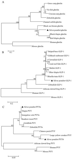 Phylogenetic analysis of (A) ghrelin, (B) GLP-1, (C) PYYa and PYYb amino acid sequences. Scale bar indicates the substitution rate per residue. Numbers at nodes indicate the bootstrap value, as percentages, obtained for 1000 replicates. GenBank accession numbers: (A) Grass carp ghrelin (AFI98391.1); Ya-fish ghrelin (AEZ36050.1); Black sea bream ghrelin (AAV65508); Black tilapia ghrelin (BAC55160.1); Red Tilapia ghrelin (BAC65151.1); Channel catfish ghrelin (NP_001187244.1); Crucian carp ghrelin (ADP55075.1); Zebrafish ghrelin (ACJ76435.1); Mouse ghrelin (AAI32231.1); Human ghrelin (ADM33790.1); (B) Clownfish GLP-1 (XP_023121936.1); Coral reef fish GLP-1 (XP_022071913.1); Striped bass (XP_035533384.1); Bluefin tuna GLP-1 (XP_042261152.1); Mullet GLP-1 (XP_047432601.1); Blue tilapia GLP-1 (XP_031584898.2); Gilthead seabream GLP-1 (XP_030266058.1); Zebrafish GLP-1 (NP_001258699.1); Mouse GLP-1 (NP_001096638); Human GLP-1 (NP_002045); African clawed frog GLP-1 (NP_001079142.1); (C) Tilapia PYY (XP_003446444.1); Senegalese sole PYYa (AML27066.1); Zebrafish PYYa (AAF79942.1); Goldfish PYY (ACJ03593.1); African clawed frog PYY (XP_018092481.2); Human PYY (CAG46926.1); Mouse PYY (AAH10821.1); Chinese perch PYY (XP_044063373.1); Large yellow croaker PYY (XP_019126422.1), and Rainbow trout (PYY P69093.1).
