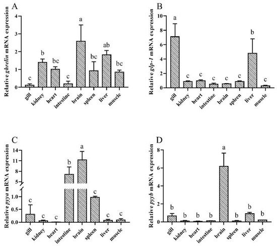 Tissue distribution of (A) ghrelin, (B) glp-1, (C) pyya, and (D) pyyb of silver pomfret (Pampus argenteus). Bars with different letters represent significant differences between different tissues (p < 0.05).