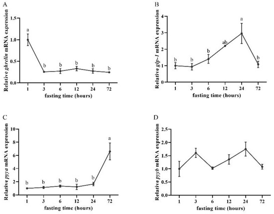 Relative expression levels of (A) ghrelin, (B) glp-1, (C) pyya, and (D) pyyb mRNA of silver pomfret (Pampus argenteus) at different fasting times. Bars with different letters represent significant differences between different time points (p < 0.05).