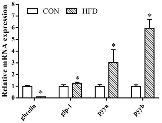 The intestine, as a key player in maintaining systemic energy balance [1], does not only absorb nutrients, but also senses nutritional value and transmits metabolic information to other tissues [2,3]. Appetite and feed intake are affected by signals from the intestine, inducing satiety and hunger. The intestine is the largest hormone producing organ, containing at least 30 hormones, some of which play a crucial role in the regulation of appetite, such as ghrelin, glucagon-like peptide-1 (GLP-1), and peptide YY (PYY) [4,5]. Ghrelin, originally reported to be present in the rat stomach [6], is the only known peripheral appetite stimulating hormone [7]. Previous studies have indicated that ghrelin regulates energy homeostasis and lipid metabolism in teleost [8]. Jönsson and coworkers demonstrated that ghrelin regulates appetite in Atlantic salmon (Salmo salar) [9] and rainbow trout (Oncorhynchus mykiss) [10]. Glucagon-like peptide-1 (GLP-1), another peptide that is found in the intestine [11], also mediates appetite, promoting satiety [12] and inhibiting food intake [13]. In teleost fish, GLP-1 could inhibit food intake in grass carp (Ctenopharyngodon idella) [13] and coho salmon (Oncorhynchus kisutch) [14]. Similarly, peptide YY (PYY), secreted by the intestine, is also an important appetite-regulating peptide [15]. In mammals, PYY acts as an indicator and anorexigenic signal [16]. The teleost PYY is comprised of two subtypes, PYYa, and PYYb [16]. Previous studies in goldfish (Carassius auratus), grass carp, Atlantic halibut (Hippoglossus hippoglossus), and Nile tilapia (Oreochromis niloticus) have demonstrated the appetite-inhibiting effect of PYYa and PYYb in teleost fish [17,18].