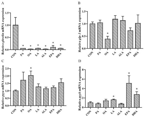 Compared with the control group, ghrelin mRNA was decreased significantly in all FA-treated groups (Figure 6A). The expression of glp-1 was also clearly less detected in the OA-treated intestine (Figure 6B). The expression of pyya was significantly upregulated by OA treatment (Figure 6C). However, pyyb mRNA was highly expressed in the LA, DHA, and EPA incubated intestine (Figure 6D).