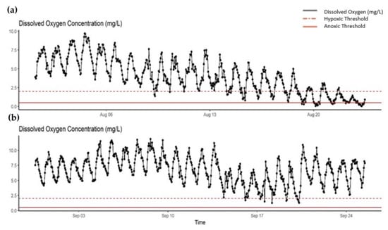 - Breitburg, D. Effects of hypoxia, and the balance between hypoxia and enrichment, on coastal fishes and fisheries. Estuaries 2002, 25, 767–781. [Google Scholar] [CrossRef]