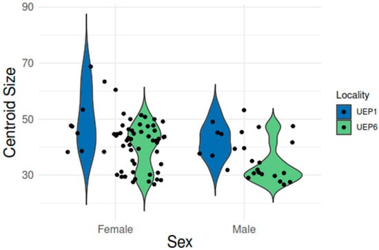 On the other hand, the violin diagram showed that UEP1 individuals tend to be larger in size than those of UEP6. It is also evident that females have a greater size dispersion than males (Figure 5).