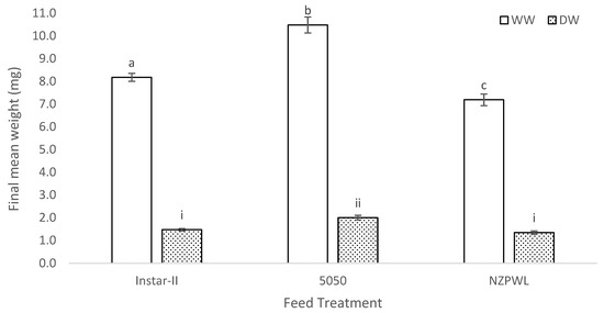 Final mean wet weight (WW) and mean dry weight (DW) for larval giant kōkopu from three different feed treatments, Instar-II+, 5050, and NZPWL, at the end of a 28-day experimental period (mean ± SE). Means with different superscripts are significantly different for WW or DW (p < 0.05).