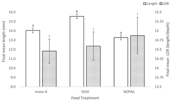 Final mean total length (primary axis) and mean length:depth ratio (secondary axis) of larval giant kōkopu for three different feed treatments, Instar-II+, 5050, and NZPWL, at the end of the 28-day experimental period (mean ± SE). Means with different superscripts are significantly different among either final mean total length or mean length:depth ratio (p < 0.05).