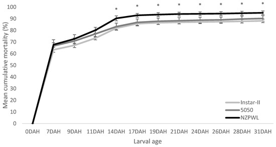 At 14 DAH, the mean cumulative mortality of thet larvae in the NZPWL treatment (i.e., 90.3 ± 2.2% SE) was greater than for the Instar-II+ treatment (i.e., 81.9 ± 1.3%) (p < 0.01) and the 5050 treatment, which had a mean mortality of 83.2 ± 3.0% (p < 0.01) (Figure 3).