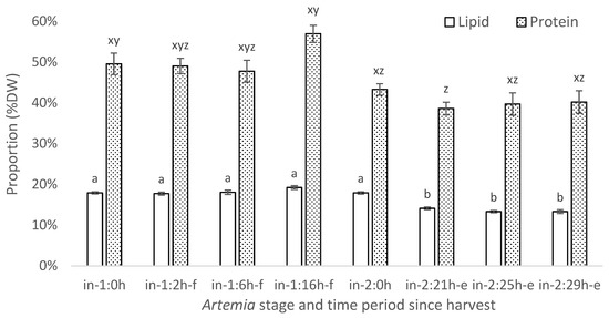 Mean lipid (no fill) and protein (shaded) proportions of Artemia as % dry weight. Annotations: in-1 refers to instar-I Artemia and 0 h denotes immediately after harvest; 2, 6, and 16 h-f denote 2, 6, and 16 h in cold store, respectively. In-2 refers to instar-II+ Artemia and 0 h immediate sampling on harvest; 21, 25, and 29h-e signify 21, 25, and 29 h enrichment, respectively. Means with different superscripts are significantly different among means for lipid and protein (p < 0.05).