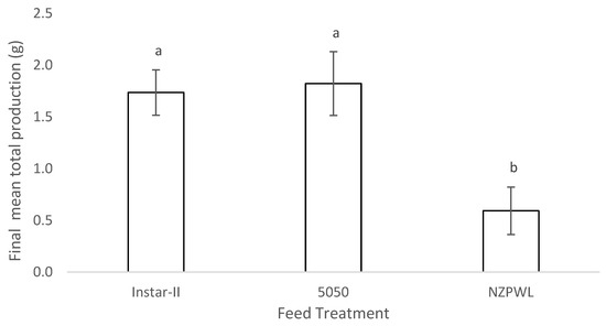 Mean total production of larval giant kōkopu resulting from three different feed treatments, Instar-II+, 5050, and NZPWL, over the 28-day experimental period (mean ± SE). Means with different superscripts are significantly different (p < 0.05).