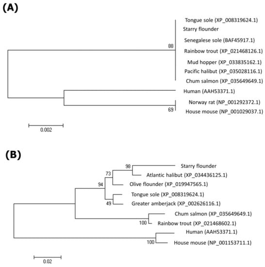 - Manchado, M.; Infante, C.; Asensio, E.; Cañavate, J.P.; Douglas, S.E. Comparative sequence analysis of the complete set of 40S ribosomal proteins in the Senegalese sole (Solea senegalensis Kaup) and Atlantic halibut (Hippoglossus hippoglossus L.) (Teleostei: Pleuronectiformes): Phylogeny and tissue- and development-specific expression. J. BMC Evol. Biol. 2007, 107, 1471–2148. [Google Scholar]