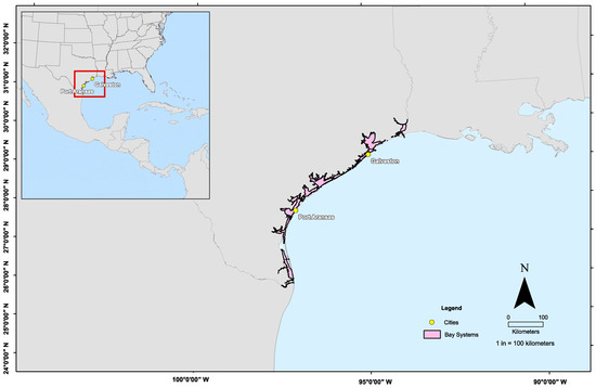The samples for this study were collected from two locations along the upper Texas coast (Galveston, TX, USA) and central Texas coast (Port Aransas, TX, USA) in the northwest Gulf of Mexico (NW GOM) during periods of high fish densities and abundances due to spawning aggregations (Figure 1). Sheepshead were opportunistically collected from recreational fishermen in Galveston (n = 35) and Port Aransas (n = 18) from March to April 2017. Sheepshead were collected from jetties, piers, and nearshore oil rigs, based on post-collection angler surveys. The biological information for each sheepshead collected included sex, weight, and total length (TL). Sex was evaluated by visually examining the gonads from the fish, either being testes (male) or ovaries (female). On site, the stomachs were removed from individuals and immediately placed in Whirl-Paks and stored in a freezer. Epaxial muscle tissue anterior to the primary dorsal fin and a piece of the liver were removed from each fish for the stable isotope analysis and stored in a freezer (−20 °C).