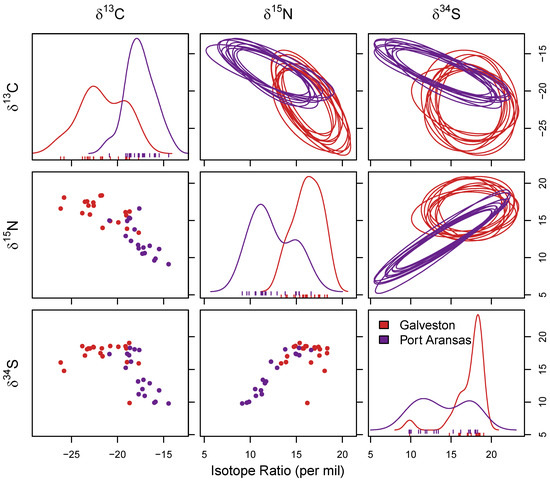 The results of the MANOVA revealed significant differences in δ13C, δ15N, and δ34S stable isotope values from the muscle tissue of sheepshead in relation to the collection location. Significant differences existed (F1,36 = 22.95; p < 0.05) in the stable isotope ratios (δ13C, δ15N, and δ34S) in the muscle samples for the sheepshead from both locations. The δ13C values indicated a significant difference between locations (F1,36 = 50.80; p < 0.05), with lower δ13C values in the muscle samples of the sheepshead from Galveston ((mean ± SD) −21.46 ± 2.81‰) relative to Port Aransas (−15.50 ± 2.28‰) (Figure 2). The δ15N values were also significantly different in the muscle samples of sheepshead between both locations (F1,36 = 69.08; p < 0.05), with higher δ15N values in the sheepshead from Galveston (18.01 ± 1.74‰) than from Port Aransas (12.57 ± 2.28‰) (Figure 2). Additionally, δ34S had significantly different values at both locations (F1,36 = 30.27; p < 0.05), with higher δ34S values in the muscle samples from the sheepshead collected in Galveston (16.98 ± 1.46‰) than Port Aransas (12.31 ± 3.47‰) (Figure 2).
