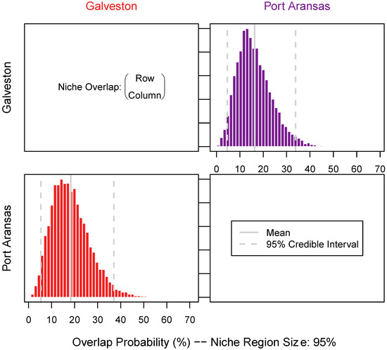 Niche overlap measured pairwise across sheepshead from both locations. Niche overlap was estimated using the 95% confidence interval of the total niche size using 10,000 random Monte Carlo draws of the niche size derived from the combined stable isotope (δ13C, δ15N, and δ34S) values measured in liver samples. Additionally, niche size was determined as row over column to estimate the proportion of sheepshead from one location (row) that was overlapped by sheepshead from another location (column).