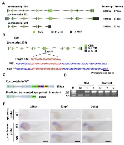 2.2. Zebrafish Husbandry and Generation of xpc−/− Zebrafish Mutant