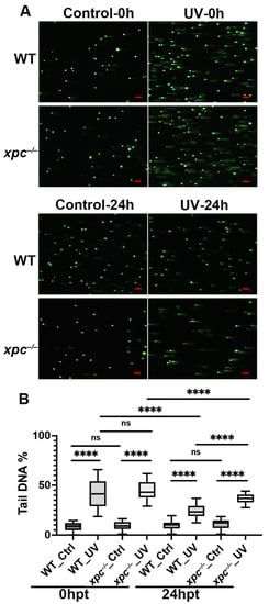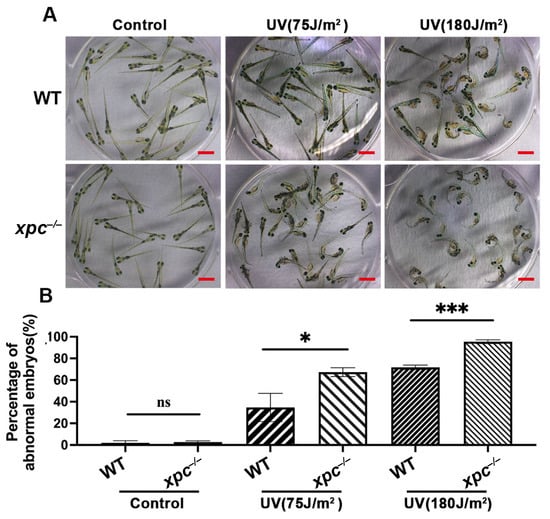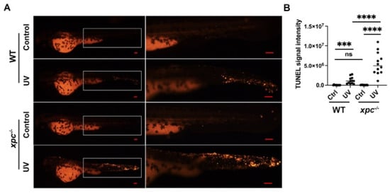 3.3. Zebrafish xpc−/− Mutant Embryos Are More Sensitive to UV Irradiation