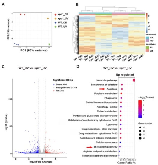 3.4. Transcriptomic Analysis Reveals That the Expression of p53 Signaling Pathway and Apoptotic Genes Is over Upregulated in xpc−/− Mutant Embryos upon UV Irradiaton