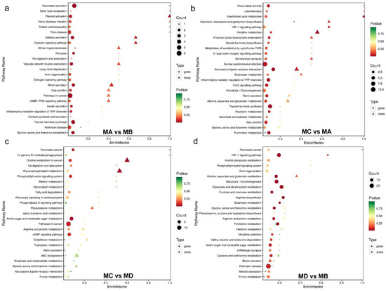 Bubble diagram based on KEGG signaling pathways among the two comparisons of (a) MA vs. MB, (b) MC vs. MA, (c) MC vs. MD, and (d) MD vs. MB. The bubble diagram is a five dimensional diagram, that is, the KEGG path enriched by different assemblages is reflected through horizontal and vertical coordinates, bubble color gradient, shape and size. When the total number of KEGG paths exceeds 25, the transcriptome will prevail, and only the top 25 p-value pathways will be displayed. The abscissa represents the enrichment factor (Diff/Background) of the pathway in different omics, and the ordinate represents the name of the KEGG path; The gradual change of red yellow green represents that the significance of enrichment changes from high to medium to low, expressed by p-value; The shape of bubbles represents different genomics, and the size of bubbles represents the number of different metabolites or genes. The larger the number, the larger the point.