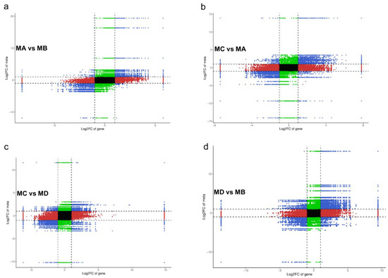 Nine quadrant diagram of correlation analysis of (a) MA vs. MB, (b) MC vs. MA, (c) MC vs. MD, and (d) MD vs. MB). The nine quadrant diagram, which is divided into 1–9 quadrants from left to right and from top to bottom with black dotted line. The abscissa represents log2FC of gene, and the ordinate represents log2FC of metabolite. Quadrant 5 shows that the differential grouping gene and metabolite are not differentially expressed. Quadrant 3, 7 show that the gene and metabolite are consistent with the differential expression mode of the metabolite. The expression change in the metabolite may be positively regulated by the gene. Quadrant 1.9 shows that contrary to the differential expression pattern of quadrant genes and metabolites, genes and metabolites with inconsistent regulation trends may be negatively regulated by genes. The expression of metabolites in quadrants 2.4, 6, and 8 remains unchanged, the genes are up and down or the gene expression remains unchanged, and the metabolites are up and down.