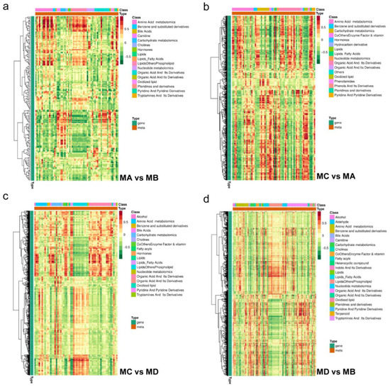 Correlation clustering heat map of (a) MA vs. MB, (b) MC vs. MA, (c) MC vs. MD, and (d) MD vs. MB. Each line in the figure is a gene, and each column is a metabolite. Red represents a positive correlation between genes and metabolites, and green represents a negative correlation between genes and metabolites.