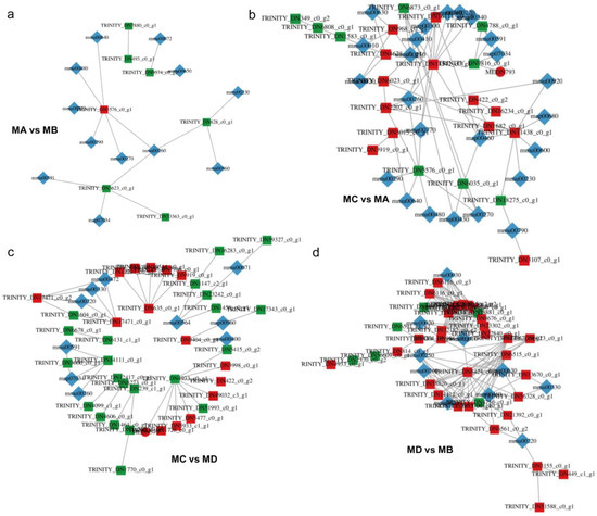 Correlation network diagram of (a) MA vs. MB, (b) MC vs. MA, (c) MC vs. MD, and (d) MD vs. MB. In the figure, metabolites are marked with green squares, and genes are marked with red circles. The solid line represents positive correlation and the dotted line represents negative correlation. In the diagram, substances of different omics are marked with different shapes.