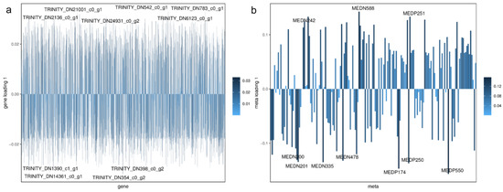 DGEs (a) and Metabolite (b) loadings diagram. The distance from each point to the origin or the height of the histogram in the figure represents the magnitude of the correlation between the substance and another omics, and the darker the color is, the greater the correlation is. The figure shows the top ten substances that have a greater impact on the other omics.