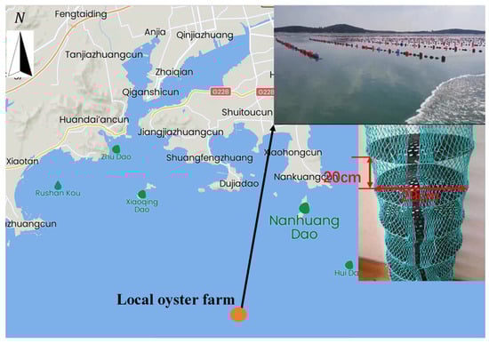 Aquatic products play an important role in improving the human dietary structure and ensuring food security [,]. The culture of marine bivalve shellfish (e.g., oysters, mussels, and scallops) farmed at an economically viable scale has been proposed to provide high-quality protein for a growing population [,]. Aquaculture areas for farming shellfish in the sea cover 60.4% of the total national aquaculture areas, in which oysters account for ~40% of the annual shellfish production in China []. In the coastal areas of northern China, the main species for seawater shellfish farming is the Pacific oyster (Crassotrea gigas), and the development of farming facilities from the initial coastal raft aquaculture to the current off-the-coast longline aquaculture is conducive to an increase in oyster production. Moreover, longline aquaculture is superior in terms of expansion to open ocean environments [,,]. However, the mechanics of submerged aquaculture facilities in relation to the marine environment have not been fully investigated and understood, and the design of longline facilities (e.g., configurations) depends on the experience of the operators with years of farming work []. Consequently, longline culture facilities are vulnerable to storms, which may cause anchor failure, rope breakage, line entanglement, drift-ice entrainment, buoy implosion, culture unit fall-off, and benthic predation [,,,,].
