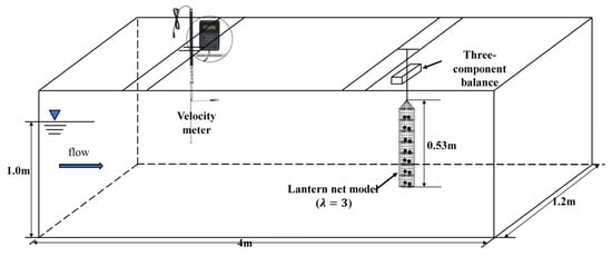 The hydrodynamic characteristics of the lantern net model were measured in a circulating flume tank at the Ocean University of China (observation section: length 4.0 m, width 1.2 m, and water depth 1.0 m). Figure 2 shows the measurement system. The model of the prototype lantern net was fabricated based on the Froude similarity law with a 1/3 length scale and 1/27 force scale. Three lantern net models with a height of 53 cm and a diameter of 9.7 cm were altered for the weights in the water of 0.5, 0.75, and 1.0 kg based on fine adjustments of gravel.