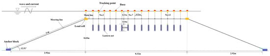 Schematic of single-row longline aquaculture facility with lantern nets in the current/wave tank.