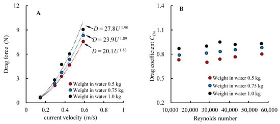 The drag coefficients of the lantern net model were calculated from the measured drag forces and projected areas of the model, and the diameter of the lantern net model was used to calculate the Reynolds number. The drag coefficient was plotted against the Reynolds number (Figure 4B). There were only slight variations in the drag coefficient of the tested model in the Reynolds number range of 1 × 104–6 × 104. The averaged drag coefficients of the lantern net model with the adopted weights of 0.5, 0.75, and 1.0 kg were determined to be 0.75, 0.83, and 0.91, respectively.