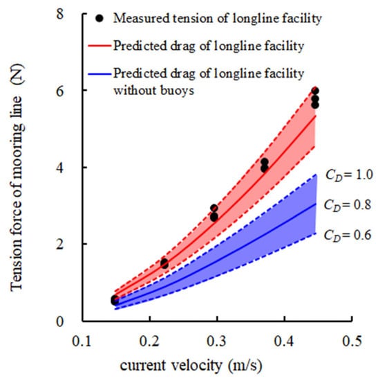 The insights into the drag distributions of lantern nets and buoys relative to the whole longline facility were considered with regard to structural design. The upstream mooring line tension of the longline facility under the current condition was estimated based on the drag forces of the lantern nets and buoys and the angle was converted using the length of the mooring line and water depth. Thus, the drag coefficients of the lantern net, i.e., 0.6 to 1.0, were considered (Figure 4B), and the drag coefficient with a value of 0.5 of the buoy as a sphere was considered. As shown in Figure 5, the purple and red areas represent the predicted mooring line tension of the longline model without and with buoys, respectively. The measured upstream mooring tensions with varying currents were consistent with those of the estimated values, with a drag coefficient of 0.8 for the lantern net. This implies that the drag coefficients of the lantern nets obtained from the flume tank experiment were reasonable. The proportions of the drag distribution of the lantern nets (drag coefficient:0.8) and buoys at 15–45 cm/s were 61.9%–56.9% and 38.1%–43.1%, respectively.