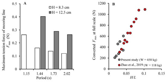 (A) Maximum tension of mooring line Fmax of the longline aquaculture facility model with lantern nets in the wave conditions at wave periods of 1.15–2.02 s and wavelengths L of 8.3 and 12.5 cm. (B) Relationship between converted Fmax at full scale of the longline aquaculture facility with lantern nets and the values of H/L from 0.01 to 0.1 (H: wave height) [].