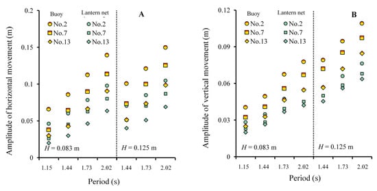Amplitudes of (A) horizontal movement and (B) vertical movement of the Nos. 2, 7, and 13 pairs of buoy and lantern nets in the wave conditions at wave periods of 1.15–2.02 s and wavelengths of 8.3 and 12.5 cm.