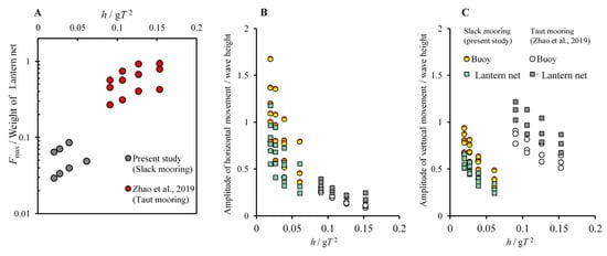 Relationships between (A) Fmax/weight of lantern nets, (B) amplitude of horizontal movement/wave height, (C) amplitude of vertical movement/wave height and h/gT2 (h: water depth, g: acceleration of gravity, T: wave period) [].