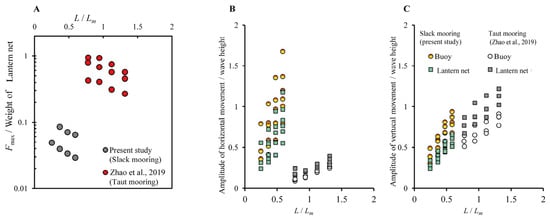 Relationships between (A) Fmax/weight of lantern nets, (B) amplitude of horizontal movement/wave height, (C) amplitude of vertical movement/wave height and L/Lm (L: wavelength, Lm: length of the main line) [].