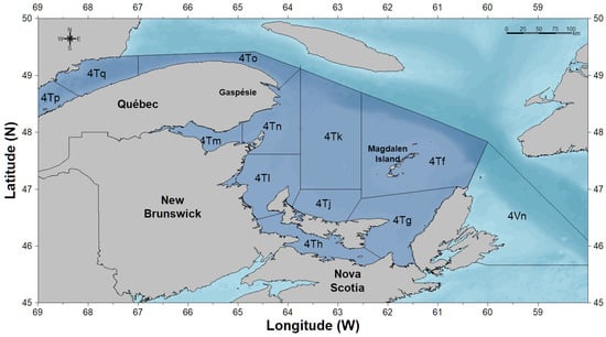 Atlantic herring (Clupea harengus-Linnaeus, 1758) is an ecologically and commercially important pelagic forage fish species that occupies the southern Gulf of St. Lawrence from the north shore of the Gaspe Peninsula down to the northern tip of Cape Breton Island, Nova Scotia, Canada (Northwest Atlantic Fisheries Organization (NAFO) Division 4T; see Figure 1) [1,2]. Within the southern Gulf of St. Lawrence, Atlantic herring consist of two genetically distinct stocks, a spring spawning and fall spawning stock [3], which generally spawn from April to May and mid-August to mid-October, respectively [4]. Individuals are known to overwinter along the north and east coasts of Cape Breton Island in NAFO Division 4T and 4Vn [5]; therefore, the stocks are referred to and assessed as 4TVn spring and fall spawning Atlantic herring [1,6].