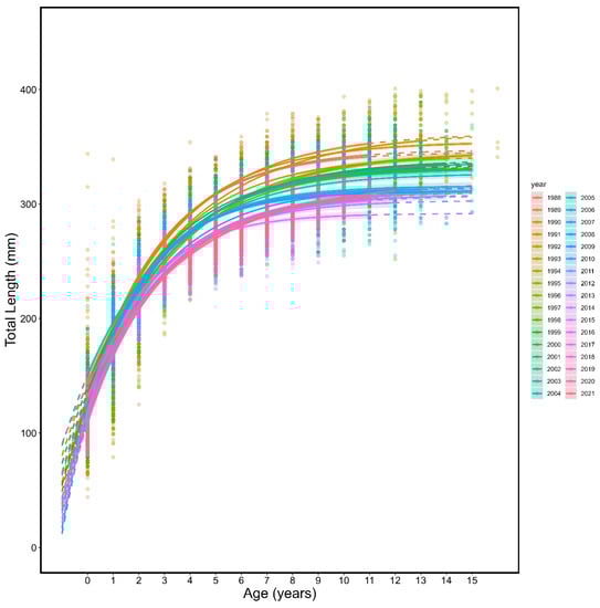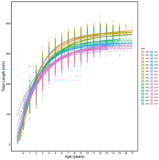 Annual von Bertalanffy growth curves (line) and individual length (mm) and age (points) colour coded by year for fall spawning Atlantic herring. The solid portion of the lines show observed age ranges and the dotted portion of lines are extrapolated to ages not observed.