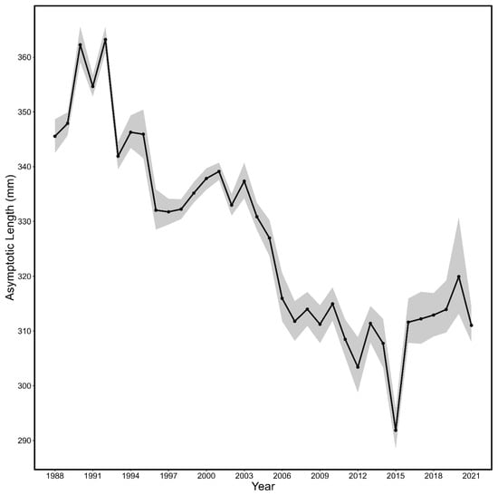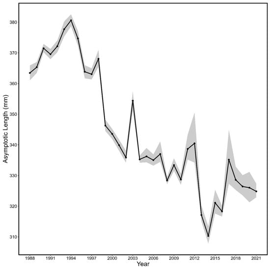 Based on our results, it appears that across the years, fall spawning herring exhibit a longer asymptotic length than spring spawning herring, implying fall spawners have the capacity to grow to a greater length than their spring spawning counterparts. Spring spawning 4TVn herring have been in the critical zone of the Fisheries and Oceans Precautionary Approach [17] since approximately 2002 [1], which coincides with the reduction in the asymptotic length of spring spawners (Figure 6). Alternatively, for fall spawners, spawning stock biomass (SSB) increased in the early 2000s despite a relatively consistent asymptotic length that was lower compared to the 1990s. However, around 2011, SSB declined rapidly [1] and coincided with drops in asymptotic length. Interestingly, the asymptotic length of Atlantic herring has undergone substantial shifts across the time series, with general reductions, suggesting both spring and fall spawning herring are not growing to as large a size as they have historically. This corroborates observations that size-at-age has generally been decreasing over the last decades across eastern Canada Atlantic herring spring and fall stocks (4VWX [18], 4R [19], 4S [20]; Newfoundland East and South coast [21,22]).
