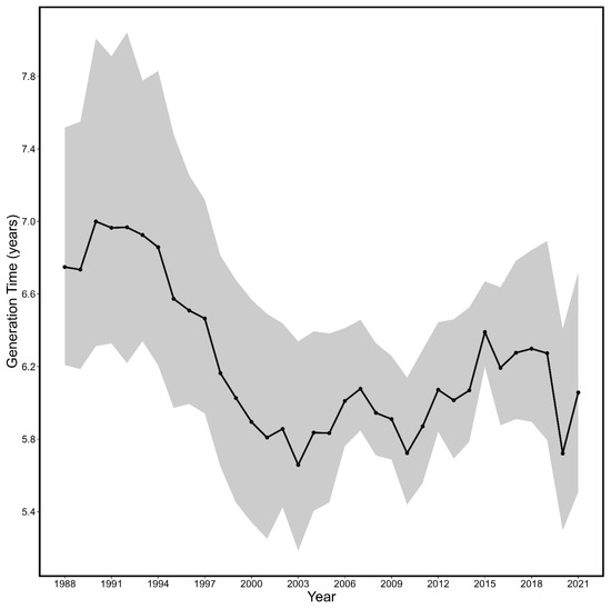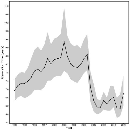 The estimated generation time associated 95% CI (shaded area) from 1988 to 2021 for fall spawning Atlantic herring.