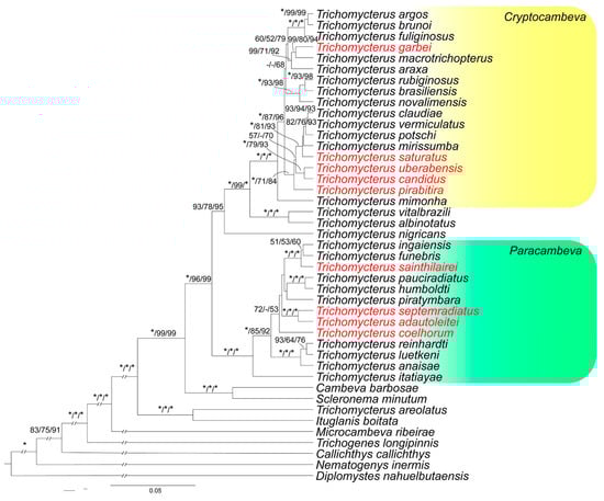 Material examined. Trichomycterus (Cryptocambeva) candidus: all localities in Brazil: Minas Gerais State: Rio Grande drainage, Rio Paraná basin. Conceição da Aparecida Municipality: MNRJ 5209, holotype; stream tributary of Rio Claro, with itself being a tributary of Rio Sapucaí, 21°05′44′′ S 46°08′46′′ W; J. C. M. Carvalho & C. Lako, October 1947. MNRJ 5356, 21 ex.; Renascença Farm; J. C. M. Carvalho & A. L. de Castro, November 1948. UFRJ 4926, 31 ex.; UFRJ 4928, 5 ex. (C&S); Riacho Cuiabá; D. Almeida, M. P. Gonçalves & M. A. Barbosa, 24 October 1999. UFRJ 12824, 6; stream near the road MG-184, 21°03′25′′ S 46°08′55′′ W, at about 800 m asl; A. M. Katz & V.M. de Azevedo Santos, 30 October 2021. Carmo do Rio Claro Municipality: UFRJ 12728, 15 ex.; Ribeirão Santa Quitéria, Cachoeira da Pedra Molhada, 21°00′18′′ S 46°14′49′′ W, at about 810 m asl; V.M. Azevedo-Santos et al., 21 July 2017. UFRJ 12826, 4 ex.; same locality as UFRJ 12728; A. M. Katz & V.M. Azevedo-Santos, 30 October 2021. Trichomycterus (Cryptocambeva) cf. candidus 1: UFRJ 8384, 16 ex.; 8391, 3 ex. (C&S); Capetinga Municipality: stream tributary of Ribeirão Antinha, Rio Grande drainage, Rio Paraná basin, 20°38′23′′ S 46°59′02′′ W, altitude about 750 m asl; V.M. Azevedo-Santos, 4 November 2011. UFRJ 8372, 5 ex.; same locality and collector as preceding, 21 August 2011. Trichomycterus (Cryptocambeva) cf. candidus 2: UFRJ 12823, 2 (C&S); stream tributary of Rio Itaci, a tributary of Rio Sapucaí, Rio Grande drainage, upper Rio Paraná basin, 20°54′58′′ S 45°56′21′′ W, about 840 m asl; A. M. Katz & V. M. Azevedo-Santos, 31 October 2021. UFRJ 12825, 2 ex.; same locality as preceding; A. M. Katz & V.M. Azevedo-Santos, 31 October 2021.