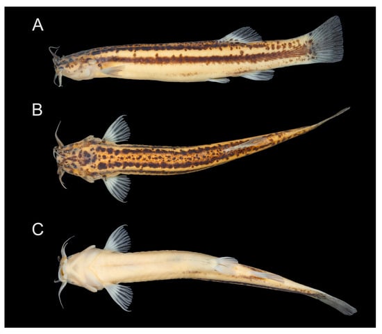 Trichomycterus (Cryptocambeva) listruroides Costa, Katz & Azevedo-Santos sp. nov. Holotype, UFRJ 11845, Capitólio, 55.1 mm SL: (A) lateral, (B) dorsal, and (C) ventral views.