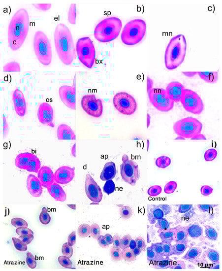 Photomicrographs of erythrocyte abnormalities in male L. spectabilis. Erythrocytes with normal morphologies (a,b) and abnormalities (c–l). Erythrocytes with normal elliptical (a), spherical, or biconvex (b) shapes. Erythrocyte abnormalities: micronuclei (c), comma-shaped (d), notched membrane (e), notched nucleus (f), binucleated (g), drop-shaped (h), blebbed membrane, apoptotic, and necrotic (i). The herbicide atrazine induced erythrocytes to have a blebbed membrane (j) and undergo more apoptosis (k) and necrosis (l) compared to normal erythrocytes in the control group (i). Abbreviations: c: cytoplasm, m: membrane, n: nucleus, el; elliptical, sp: spherical, bx: biconvex, d: droplet, bm: blebbed membrane, bi: binucleated, cs: comma-shaped, nm: notched membrane, nn: notched nucleus, ap: apoptotic, ne: necrotic, *: released cytoplasm. Giemsa stain. Bar: 10 m.