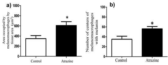 The area occupied and melanin presence of melanomacrophage centers. The area occupied by melanomacrophage centers (mean ± SE) in the livers of male L. spectabilis was larger in the atrazine-exposed group compared to the control group (a). The atrazine group also had significantly higher numbers of melanomacrophage centers in livers with melanin (mean ± SE) compared to the control group (b). An asterisk indicates a statistically significant difference compared to the control group.