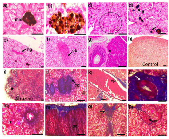 Cytological preparations showing liver tissue in male L. spectabilis frogs exposed to the herbicide atrazine and controls. The melanomacrophage (mm) area was smaller in the control group (a) than the atrazine-exposed group (b). In the atrazine group, there were liver lesions, including: (c) infiltration of immune cells (circle), (d) infiltration of lymphocytes (lf) in the liver tissue, (e) patches of hemorrhage (hg), (f) congestion of blood vessels (cb), (g) degeneration of liver tissue (arrowhead), (i) liver tissue with collagen (*) deposition, and (j) collagen (cg) deposition between hepatocytes (compare to (h) liver tissue without collagen in the control group). In the hepatic triad (k), portal vein (vp), bile duct (black arrow), and hepatic artery (white arrow), there were (l) degeneration and sloughing of epithelium in the biliary duct (black arrows), (m) atrophy of hepatocytes (arrowhead), (n) deposition of collagen in the subcapsular hematopoietic tissue (hs) and disorganized parenchyma (p), (o) reticular collagen fibers distributed between the hepatic cords (arrow), and (p) erythrocyte infiltration (er). (a–g) H&E stain; (h–p) Masson’s trichrome. Scale bars represent 10 and 20 m.