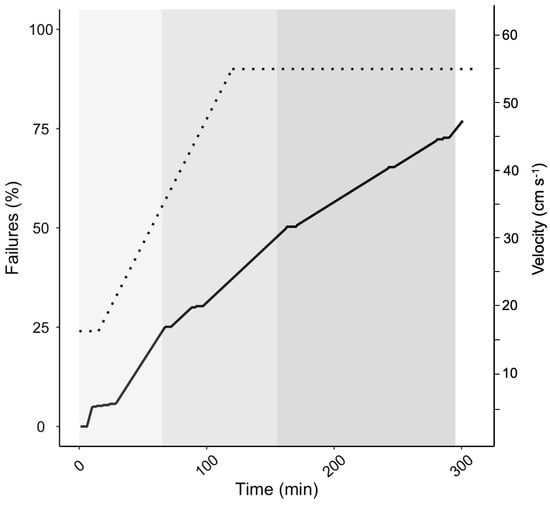 Endurance screening protocol for rainbow trout. Dotted line is water velocity; solid line is cumulative percentage of fish failures. The increasingly shaded regions delineate each failure quartile.