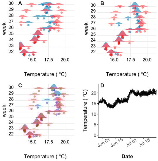 Weekly density (bandwidth 0.3) plots of temperature quantiles for Pete’s Pothole (PPH) transmitter (Vemco VP TP transmitters) logs for diploid (blue) and triploid (red) Blackwater rainbow trout (Oncorhynchus mykiss). (A) 25th quantile, (B) median, (C) 75th quantile. In (A–C), Y-axis is week of the year and week 22 corresponds to the week of 26 May to 30 May, where fish were stocked into PPH on 26 May, and week 30 corresponds to 21 July to 25 July. Dots on the bottom of each weekly plot indicate the temperature quantile for each individual fish alive in the lake during that week. (D) PPH surface temperature through the summer of 2008.