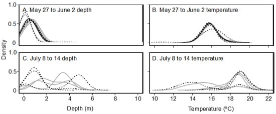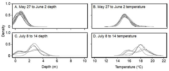Kernel density plots of telemetry (Vemco VP TP transmitters) water depths (A,C) and temperature (B,D) logs for Blackwater rainbow trout (Oncorhynchus mykiss) in Bluey Pothole 2 in 2008. Gray lines represent diploid (2N) trout and dotted black lines represent triploid (3N) trout from 27 May to 1 June (A,B) and 8 to 14 July (C,D). From 27 May to 2 June, n was 11 for 2N and 7 for 3N. From 8 to 14 July, n was 4 for 2N and 1 for 3N.