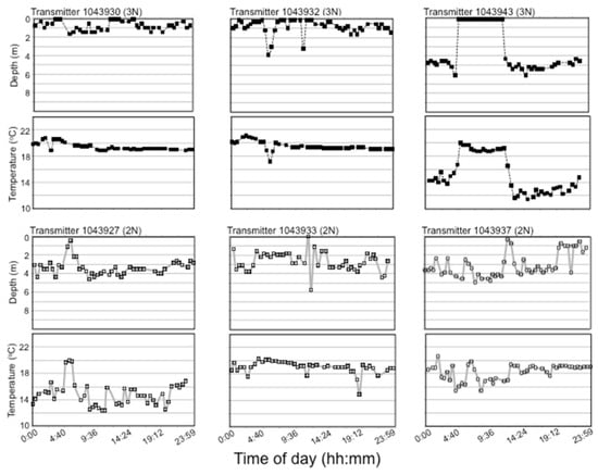 Plots of 24 h temperature and depth utilization were also analyzed to investigate interindividual and interploidy variability during warm summer temperatures. As all fish spent the entire day at the lake surface at the beginning of the summer and individual differences did not appear until surface temperature exceeded 18 °C, 24 h habitat utilization was compared for July 10, and only for the 6-transmitter fish (three each of 2N and 3N fish) in PPH that survived until the end of July. Only one 3N fish remained alive in BPH by July 10, so these comparisons were note performed for BPH.