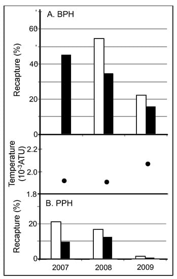 Diploid (□) and triploid (■) Blackwater rainbow trout (Oncorhynchus mykiss) recapture in Pete’s Pothole (PPH; a warm lake with avian piscivores prevalent) (A) and Bluey Pothole 2 (BPH; a cool lake with lower avian piscivore prevalence) (B) in the summers of 2007, 2008 and 2009. (●): accumulated thermal units (ATU) calculated across June, July and August of each year based on Merritt, British Columbia air temperatures obtained from the Environment Canada database.