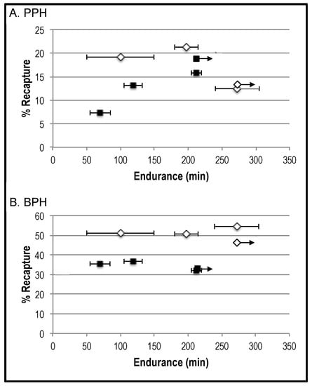 Summer 2008 lake recapture and average endurance swimming of endurance-screened 2N (◇) and 3N (■) quartiles of Blackwater rainbow trout (Oncorhynchus mykiss) in PPH (a warm, high predation lake) (A) and BPH (a cool, low predation lake) (B). Arrows represent the 4th endurance quartile, mean endurance swimming of which is unknown, but greater than that of the 3rd quartile of the same ploidy.