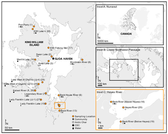 Fishing sites in the Kitikmeot region of Nunavut (NU) were located within 400 km of King William Island (KWI) and the community of Gjoa Haven, including the saline water bodies of Rasmussen Basin and Chantrey Inlet. Freshwater sites included six lakes and rivers, including a traditional stone weir river site (Figure 1). The subsistence fishing locations were chosen based on IQ sharing by local Inuit elders in association with the Hunters and Trappers Association of Gjoa Haven, NU. Licenses to fish for scientific purposes were obtained in accordance with section 52 of the general fishery regulations of the Fisheries Act, Department of Fisheries and Oceans Canada (DFO), and water was sampled as permitted by the Nunavut Impact Review Board. Animal care permits were issued by the Freshwater Institute Animal Care Committee of DFO (S-18/19-1045-NU and FWI-ACC AUP-2018-63).